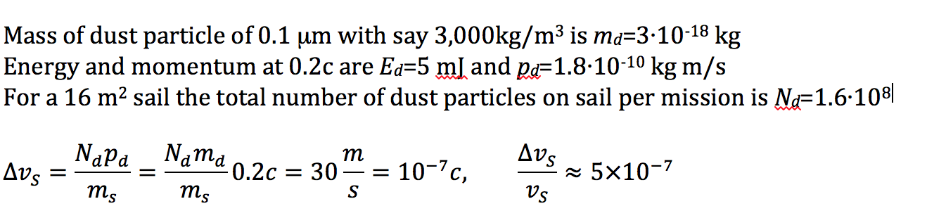 If all particles stop in the sail we get less than 1ppm change in nanosat velocity. However, particles on 15 nm sail will perforate the sail and not stop and thus transfer less than 10-3 of momentum, resulting on a change in nanosat velocity of less than 1ppb.